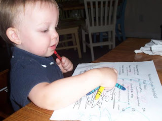 we went out to eat one nite (7 adults, 3 1/2 babies) and trace got to color. we don't let him color much at home... b/c he eats the crayons! here he is cracking me up b/c he has like 5 crayons in his hand at once!! love it!